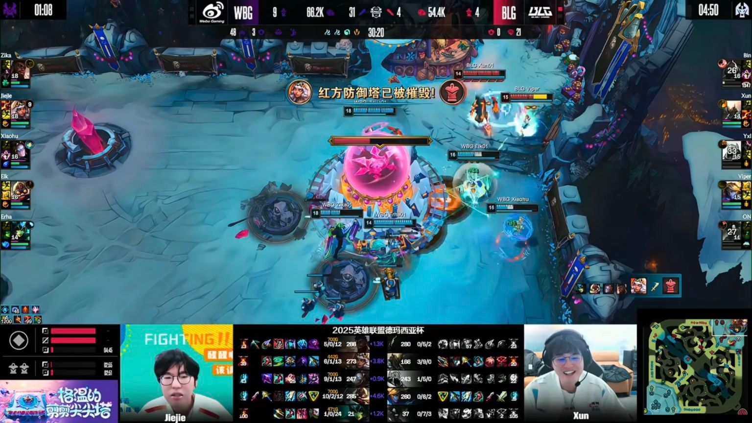 On WBG’s side, Zika was crushed by Bin in all but the second game where he played Kha’Zix. Yahang was repeatedly solo killed, while the wolf mother returned to basics with her pick. Bobo’s skillshots missed badly; if not for strong teammates, the top lane would have been a huge problem. The most interesting part was the jungle duel: in the deciding game’s blind pick, both Jiejie and Xun locked in Jayce, but their performances were worlds apart, with Xun being completely outplayed.