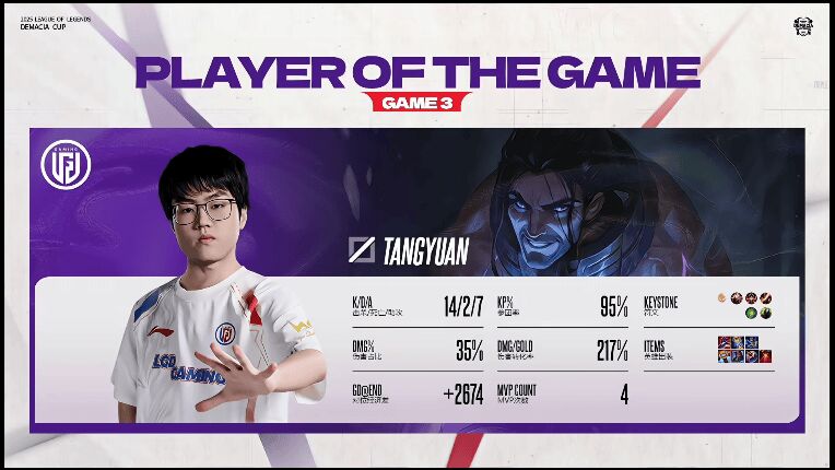 In the final game, AL’s second team mid laner stood out, solo-killing Tangyuan in lane and having over 30 CS lead at 11 minutes. The other lanes were also relatively even. But once teamfights started, the pattern repeated: LGD’s superior coordination pulled AL apart. Tangyuan, who had been solo-killed earlier, began roaming ineffectively during fights. The match ended at 30 minutes with Tangyuan posting an impressive 14-2-7 score, earning MVP for the second consecutive game.
