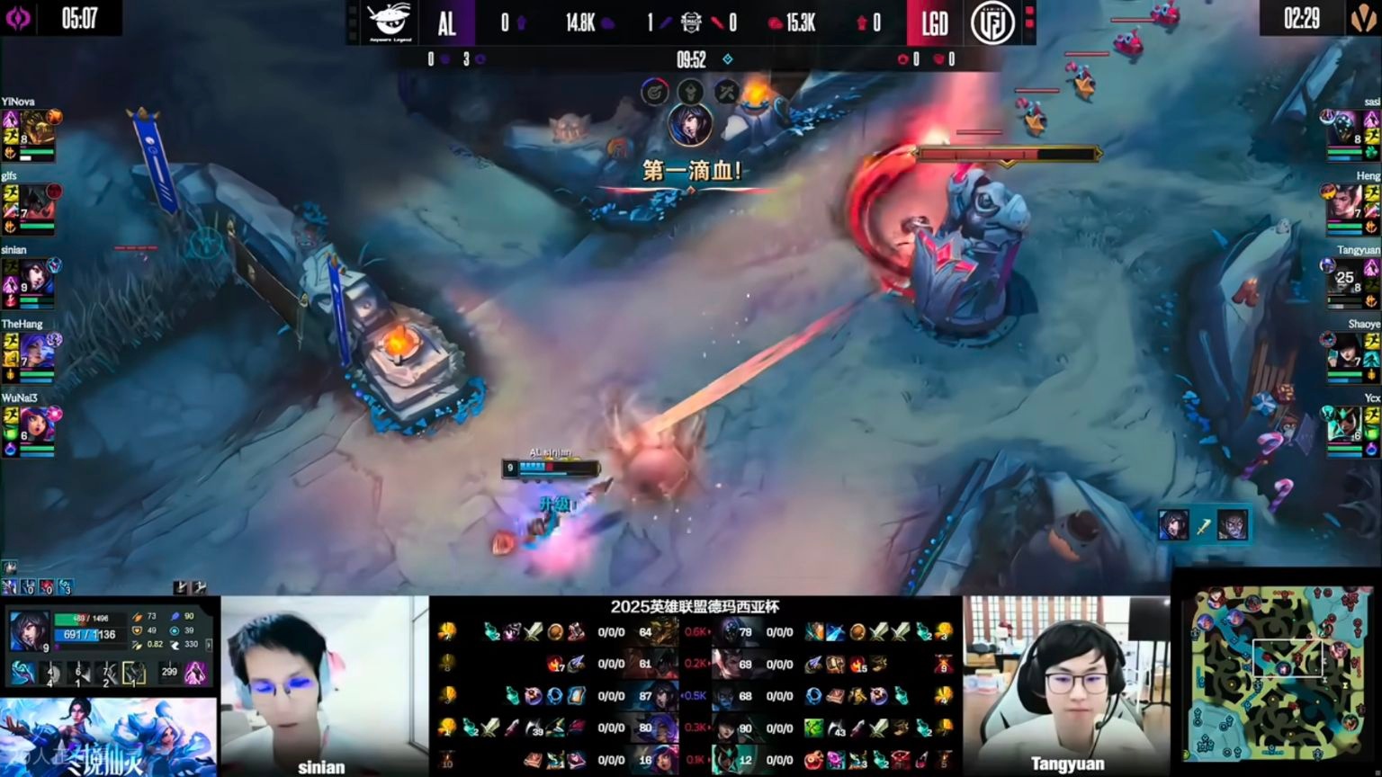 In the first game, AL’s second team held up decently in the laning phase — except for top lane, mid and bot farm were on par. But once small skirmishes began, things went wrong. At the 15-minute Rift Herald fight, AL initiated on the enemy tank, but their two carries got stuck on the flank and couldn’t deal damage. LGD capitalized with a 1-for-4 trade, effectively ending the match. They then pushed towers easily to close out the game.