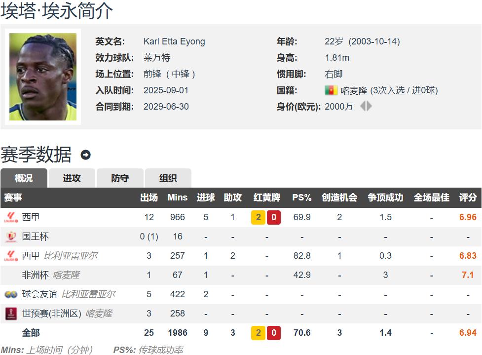Now 22 years old, Ayong stands 1.81 meters tall and is a right-footed center forward. His contract with Levante runs until 2029. So far this season, he has played 16 matches, starting 15 of them, and has contributed 6 goals and 3 assists.