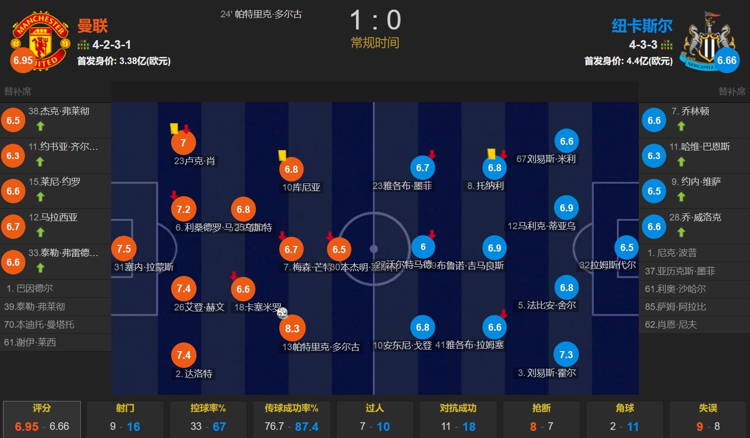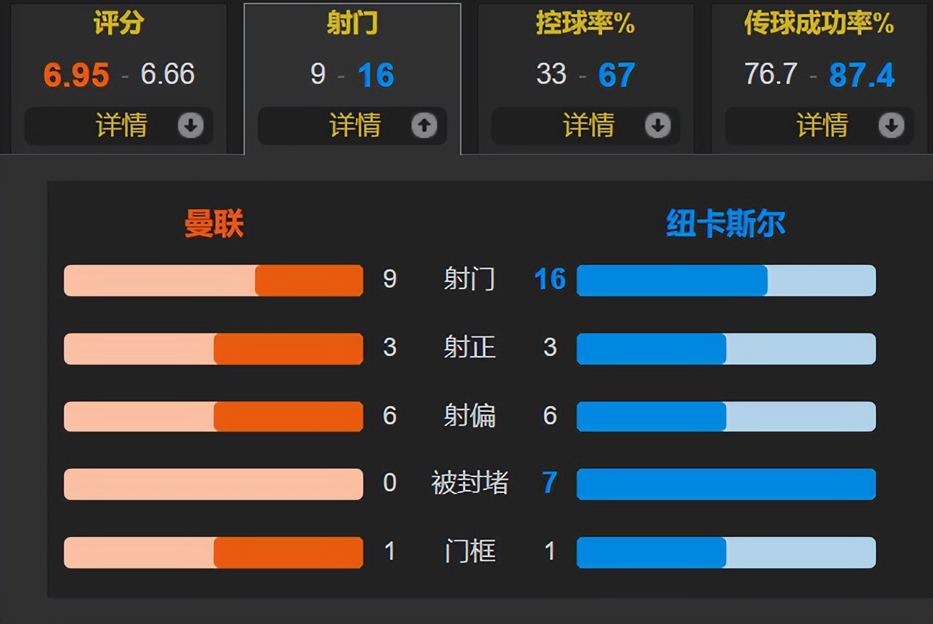 Looking at the match stats, Manchester United’s home possession was only 33%, allowing Newcastle, who struggle in tight matches, to attack more on the road—this reflects half the success of Amrabat’s tactics. United had 9 shots, 7 fewer than Newcastle, but both teams registered 7 shots on target.