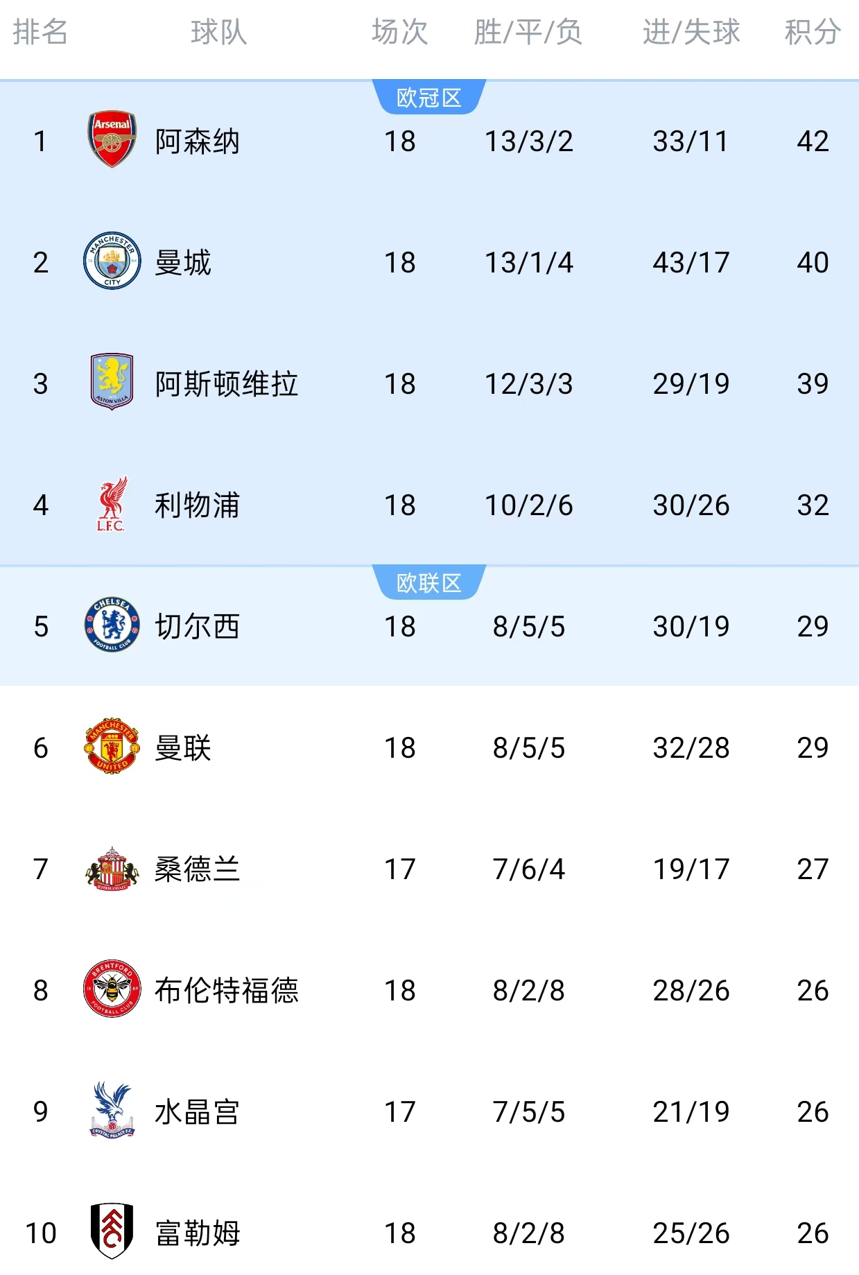On Saturday night, the 18th round of the Premier League saw four Big Six clashes, each ending 2-1. Manchester City, Arsenal, and Liverpool all secured 2-1 victories, while Chelsea lost 1-2 at home to the in-form Aston Villa. The top three in the Premier League remain closely contested with just a three-point gap, but fourth-placed Chelsea has fallen behind, now trailing Liverpool—who are on a three-game winning streak—by three points and dropping to fifth.