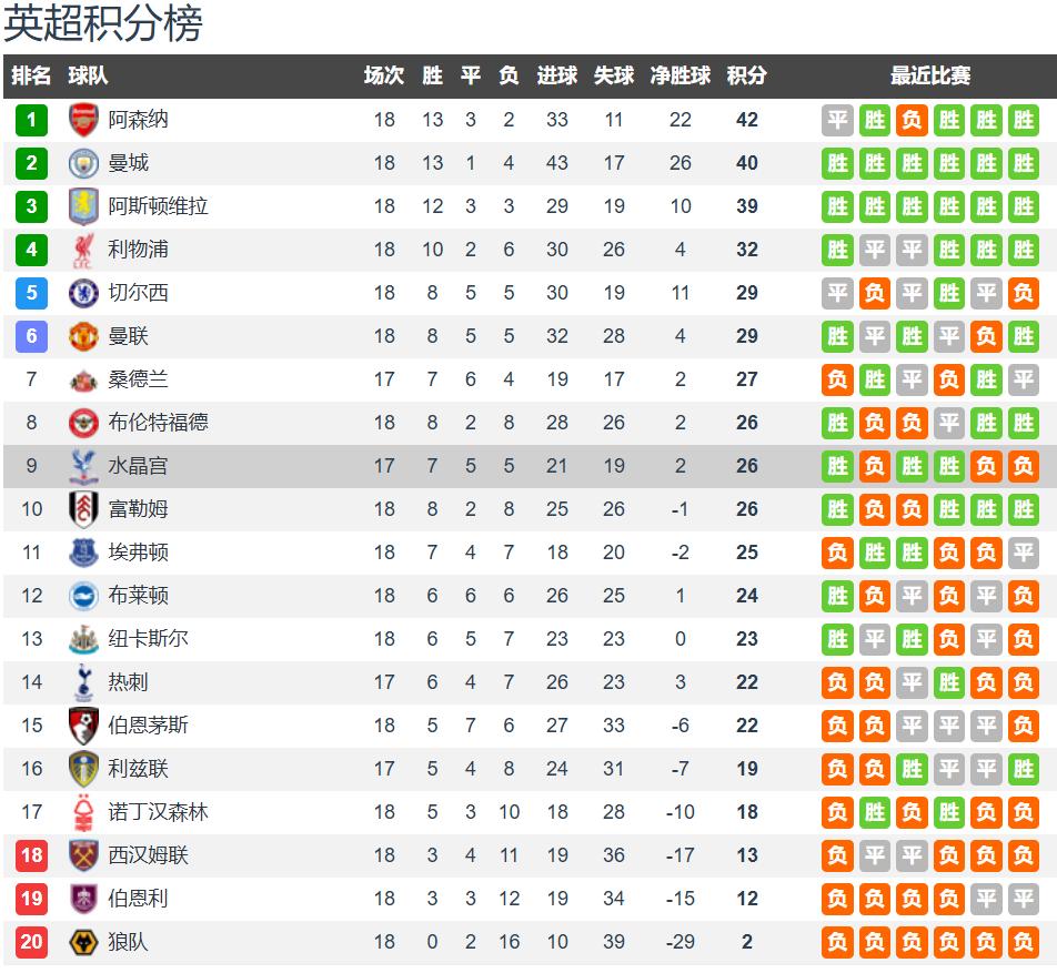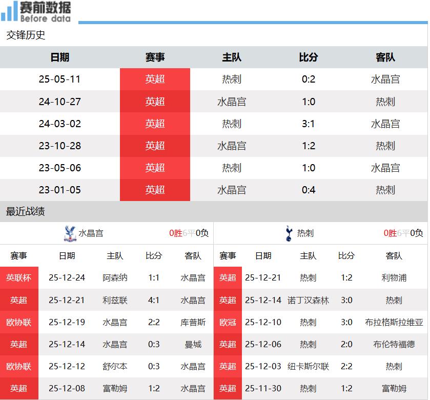 First:Team situations! After 17 Premier League rounds, Crystal Palace holds 7 wins, 5 draws, and 5 losses, accumulating 26 points and ranking ninth; Tottenham has 6 wins, 4 draws, and 7 losses, with 22 points, placed fourteenth. In the last round, Crystal Palace suffered a heavy 1-4 defeat away to newly promoted Leeds United, marking two consecutive league losses, and were eliminated from the Europa League after a penalty shootout loss to Arsenal midweek; Tottenham lost 1-2 at home to Liverpool, with key players Sessegnon and Romero sent off, also enduring two straight league defeats and only one win in the last eight league matches.