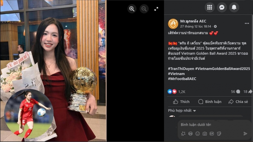 The page further described: “Trần Thị Duyên, defender of the Vietnam women's national team – silver medalist at the 2025 SEA Games, appeared stunning in an evening gown at the Vietnam Golden Ball Award Gala 2025, shining brightly and becoming the center of attention at the event.” The compliments from Thai media highlight the growing influence of Vietnamese female players, not only for their skills but also their image off the field.