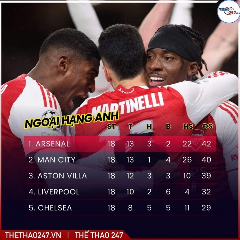 After round 18, the Premier League enters a phase where the top spot is clearly defined. Arsenal, Man City, and Aston Villa all secured wins, forming a tight “three-horse” chase. The small point gap makes every upcoming match crucial.