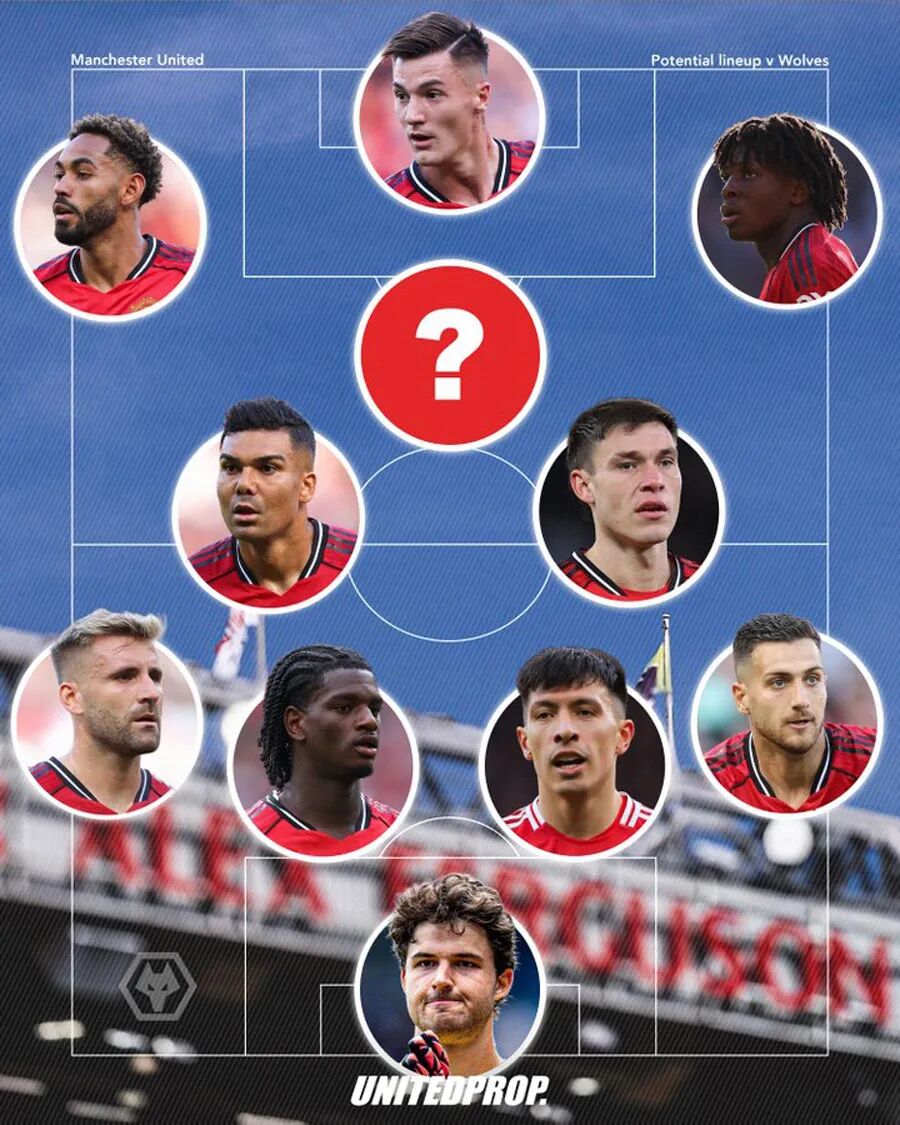 Predicted Manchester United starting lineup against Wolves: Senna Lamens / Diogo Dalot, Eden Haven, Lisandro Martínez, Luke Shaw / Casemiro, Ugarte / Patrick Dogu, Zirkzee, Cunha / Sheshko.