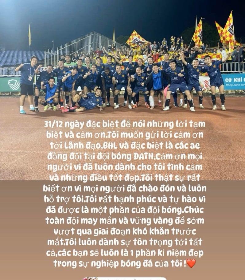 On December 31st, the defender from Nghệ An posted an emotional message on his personal page, officially confirming his departure from the team: “December 31st is a special day to say goodbye and give thanks. I want to express my gratitude to the management, coaching staff, and teammates at Đông Á Thanh Hóa. Thank you all for your love and support. I am proud to have been a part of this club.”