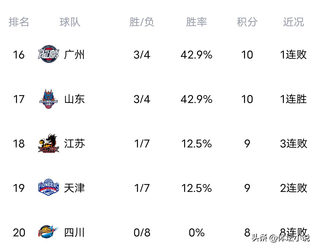 Currently, in the latest standings, Shanghai has achieved five consecutive wins and leads the table after playing one more game. Guangdong is the only team with an eight-game winning streak, ranking second. Defending champions Guangsha, Beijing, and Qingdao all hold 7-1 records, placing third, fourth, and fifth respectively. The difference among the top five is just one point, meaning the top position could change at any time. Teams that have clearly declined include Liaoning, Zhejiang, and Xinjiang. Jiangsu and Tianjin have only managed one win and seven losses, while Sichuan is at the bottom with a harsh eight-game losing streak!