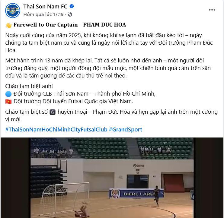 On the last day of 2025, the Vietnamese sports community bid farewell to one of the greatest icons in futsal. Ho Chi Minh City’s Thai Son Nam Club officially released a tribute and confirmed that captain Pham Duc Hoa has chosen to end his professional playing career. A 13-year journey full of glory, resilience, and extraordinary effort has come to a close.