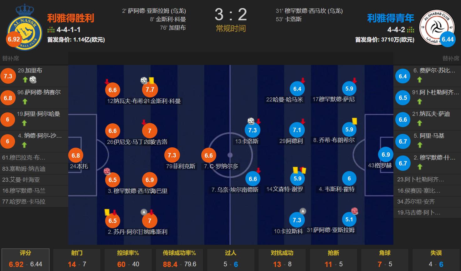 In the first half, Felix forced an own goal, Coman scored a bicycle kick to increase the lead, and Simakan accidentally scored an own goal, leaving Al-Nassr ahead 2-1 at halftime; in the second half, Cavaho scored a solo goal to level the match, Shiro received a red card, and Galeb scored off the bench.