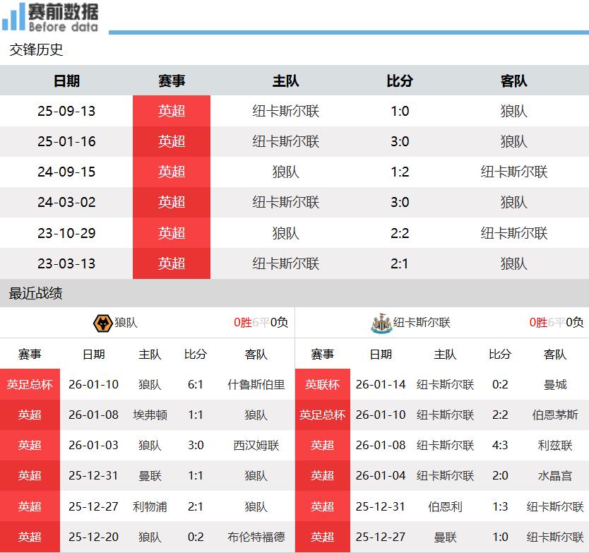 First:The situation of both teams! After 21 rounds of the Premier League, Wolves have 1 win, 4 draws, and 16 losses with 7 points, ranking last, while Newcastle has 9 wins, 5 draws, and 7 losses with 32 points, ranking ninth. In the last Premier League round, Wolves drew 1-1 away against Everton, remaining unbeaten in their last three league matches with 1 win and 2 draws, regaining confidence. They then advanced in the FA Cup with a 6-1 win over an English League Two team. Newcastle narrowly won 4-3 at home against Leeds United, achieving a three-match winning streak in the league, and advanced in the FA Cup after a penalty shootout win over Bournemouth. However, they lost 0-2 at home to Manchester City in the first leg of the League Cup semi-final midweek.
