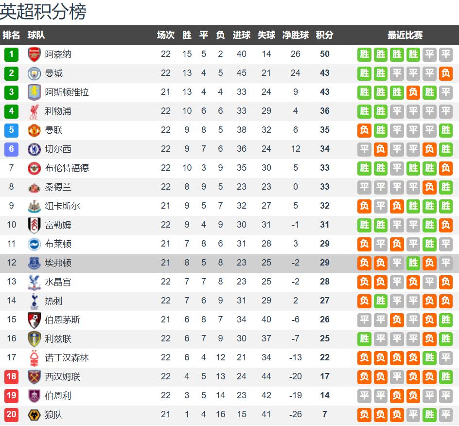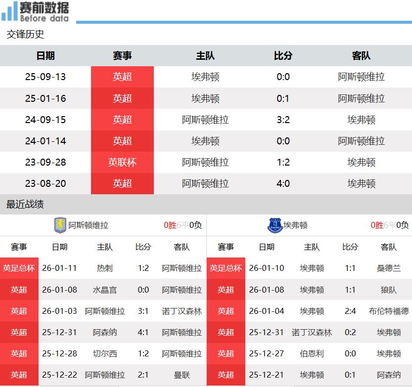 First:Team SituationsAfter 21 rounds of the Premier League, Aston Villa has 13 wins, 4 draws, and 4 losses, accumulating 43 points and ranking third, while Everton has 8 wins, 5 draws, and 8 losses, with 29 points, placing twelfth. In the last Premier League round, Aston Villa drew 0-0 away at Crystal Palace and then defeated Tottenham 2-1 in the FA Cup away match to advance; Everton drew 1-1 at home against Wolves and has only one win in their last six league games.
