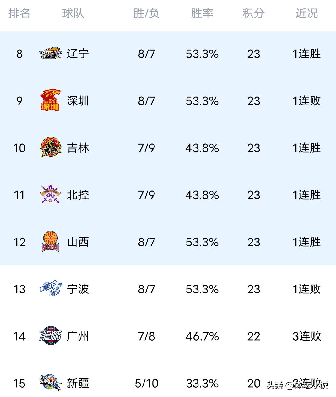 On January 18th Beijing time, the CBA regular season went on with several games ending last night. Guangdong was narrowly upset 98-99 by Beijing Enterprises, Jiangsu surged to a surprising 106-101 win over Shandong, Qingdao held firm to beat Zhejiang 87-76, Sichuan was overwhelmed 79-103 by Jilin, and top team Guangsha soared with a 109-82 thrashing of Guangzhou. As a result, the latest standings have been updated: Guangsha first, Guangdong second, Shandong fifth, Zhejiang seventh!