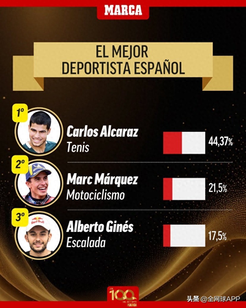 On December 30 local time, the results of the 2025 Spain’s Best Athlete voted by Spain's Marca newspaper were revealed. Alcaraz, who reclaimed the ATP year-end world No.1 spot this year, secured 44.37% of the votes, decisively beating motorcycle racer Márquez (21.5%) and climber Hines (17.5%). Additionally, Sabalenka was honored as the 2025 International Best Female Athlete.