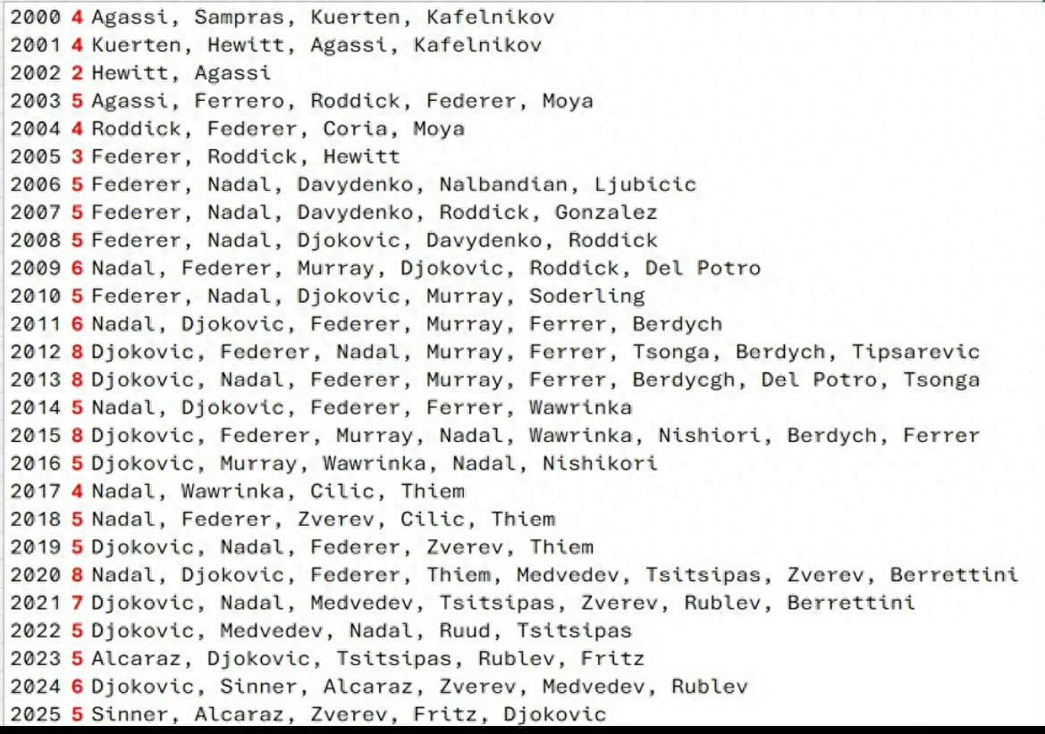 Today is the last day of 2025. Looking back on this year, some newcomers entered the world top ten, while others stayed in the top ten throughout the entire season. So, reviewing the world top ten over the past two decades, who has been the most consistent player? Undoubtedly, Federer, Nadal, and Djokovic have been the most stable players over the last twenty years!