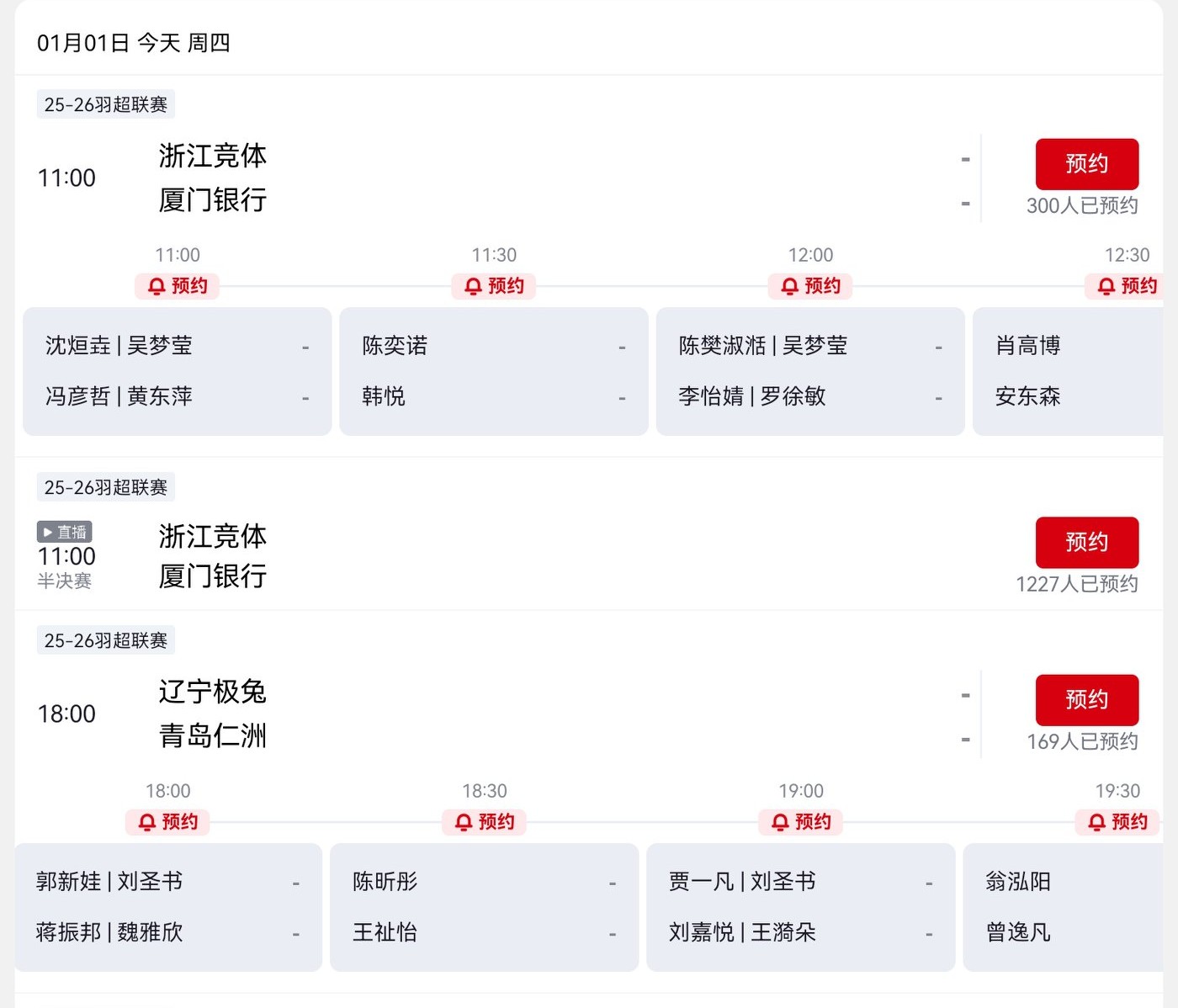 The badminton Super League semifinals are happening today (2026.1.1), with Feng Yanzhe and Huang Dongping participating, live on CCTV+ and Youku.