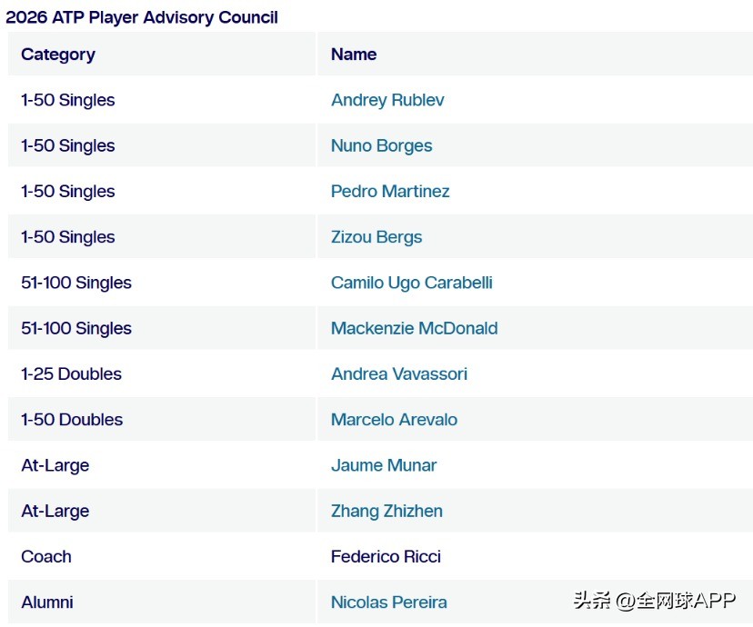 On January 1, 2026, ATP’s official site revealed the 2026 Player Advisory Council roster. Zhang Zhizhen from China was elected for the first time, alongside Arevalo, Berrettini, and Borges as this year's four new player representatives, beginning their three-year term from 2026 through 2028. McDonald was re-elected for a second three-year term (also 2026-2028). Together with Carabelli, Martinez, Munar, Rublev, and Vavassori, they form the 2026 ATP Player Advisory Council.