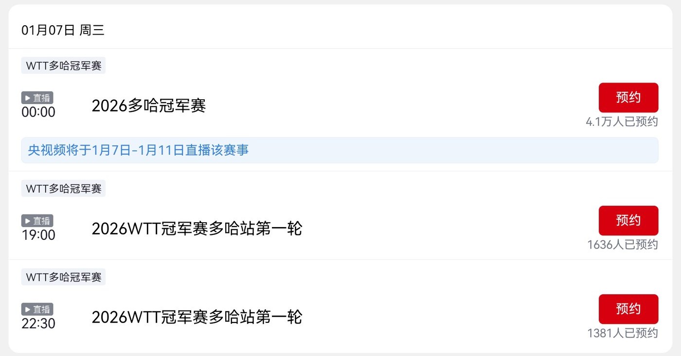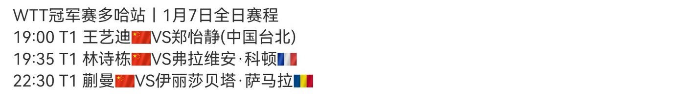 The WTT Table Tennis Champions Doha station schedule for tomorrow (January 7, 2025) features Chinese players Lin Shidong, Kuai Man, and Wang Yidi competing, with live broadcast on Yangshipin.