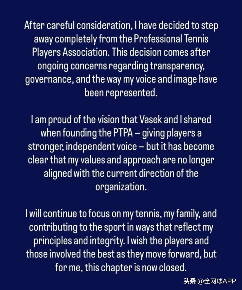On January 5th Beijing time, Serbian tennis icon Novak Djokovic declared via his personal social media that he is stepping down from the Professional Tennis Players Association (PTPA). This group was co-founded by him and Vasek Pospisil in 2019 and formally launched at the 2020 US Open during the pandemic. Early members also featured Mattek, Isner, Jabeur, Hurkacz, Badosa, and Zheng Saisai.