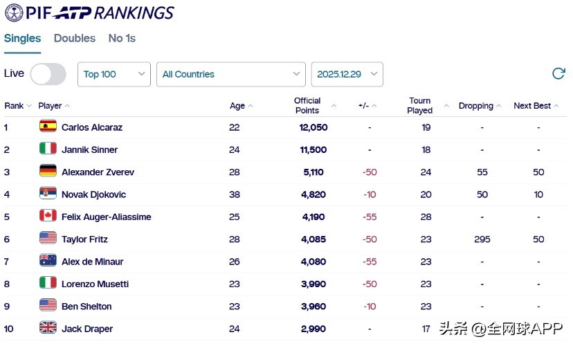 This adjustment took effect in the first week of the new season. Among the top 10 players, only Alcaraz, Sinner, and Draper were unaffected; the other seven players saw a slight drop in points due to the removal of one best counted tournament from their rankings, though this reduction did not disrupt the standings among the elite group.