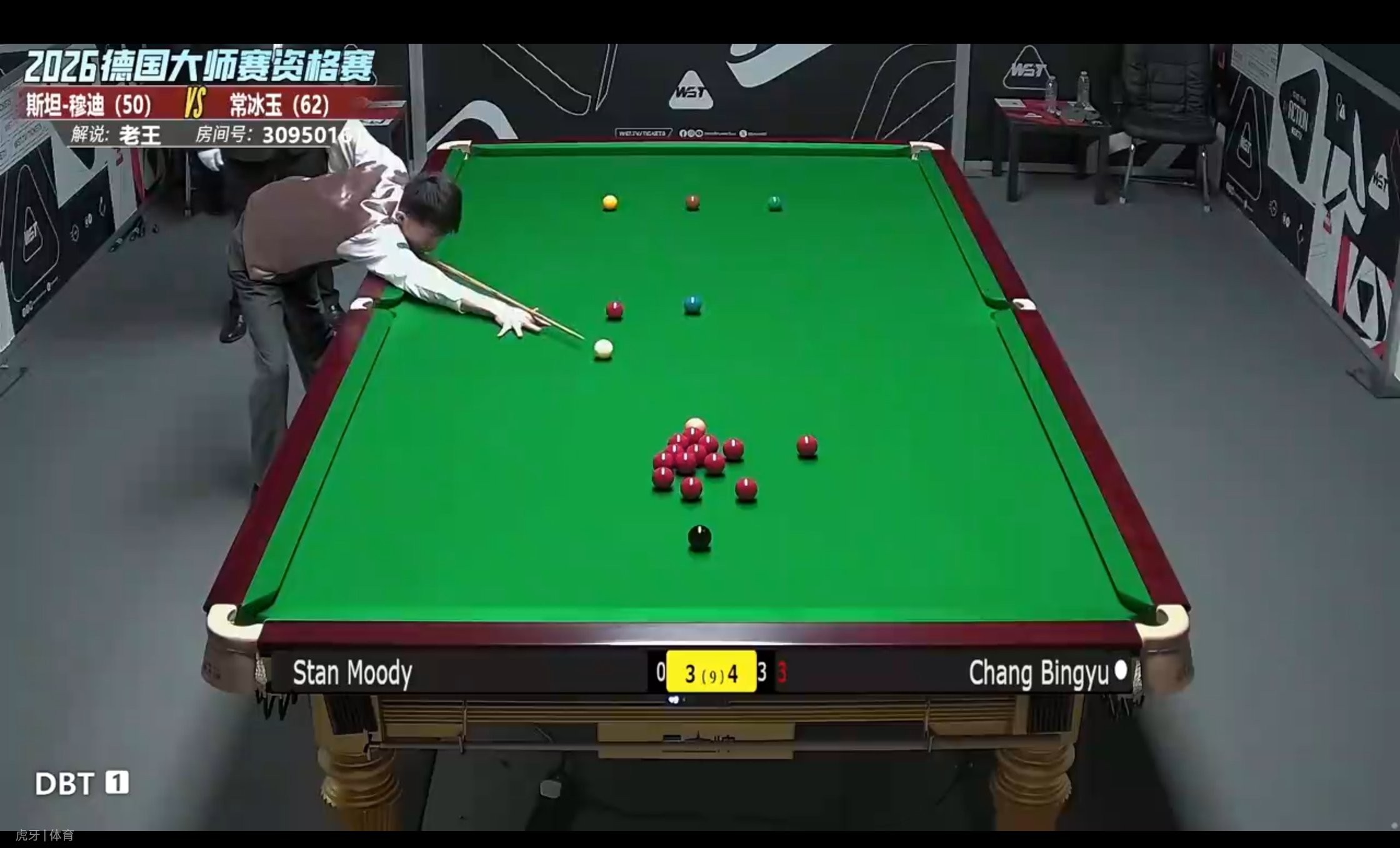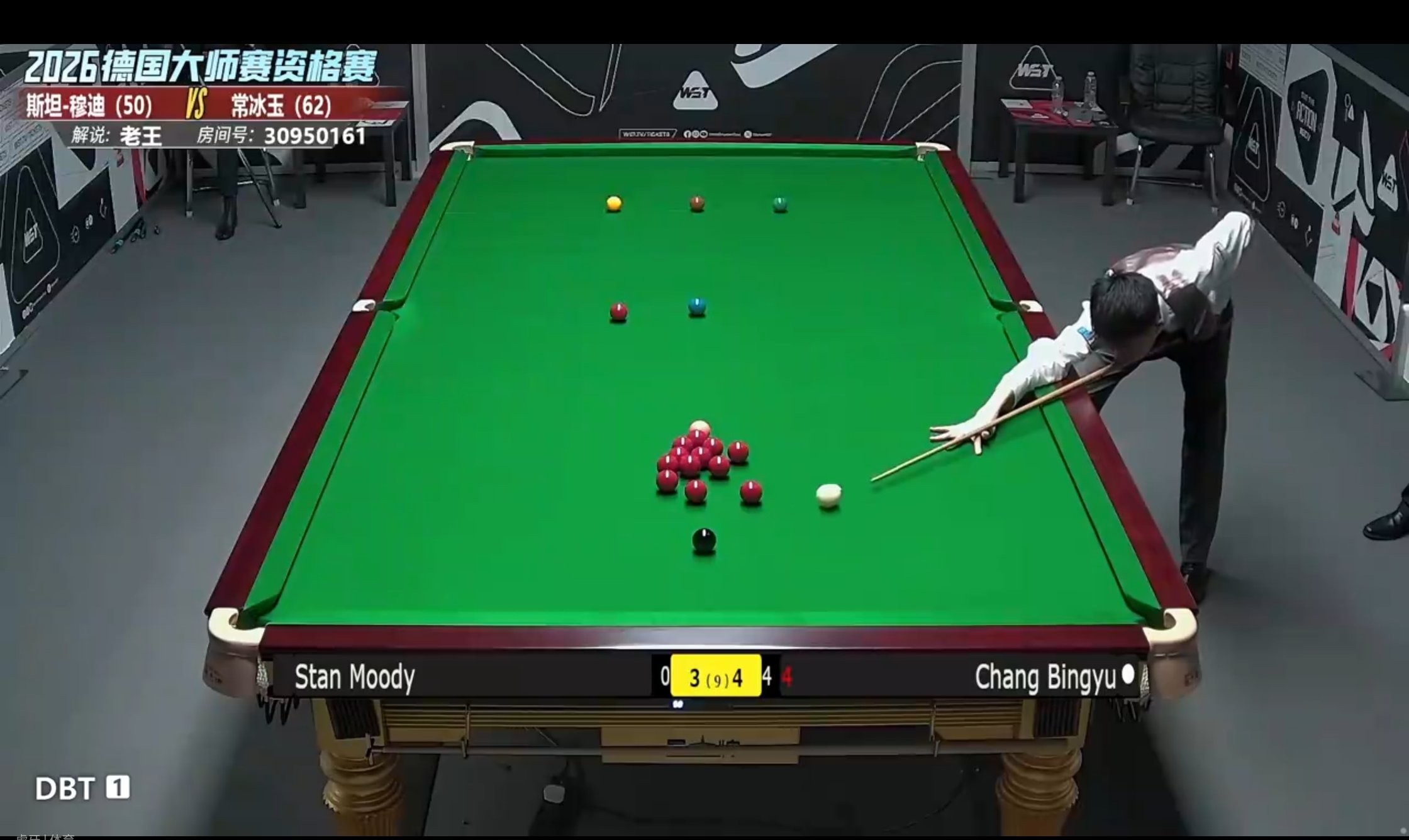 The match is played in a best-of-nine frames format. At present, Chang Bingyu is ahead of Stan Moody 4-3 and has reached the first match point.