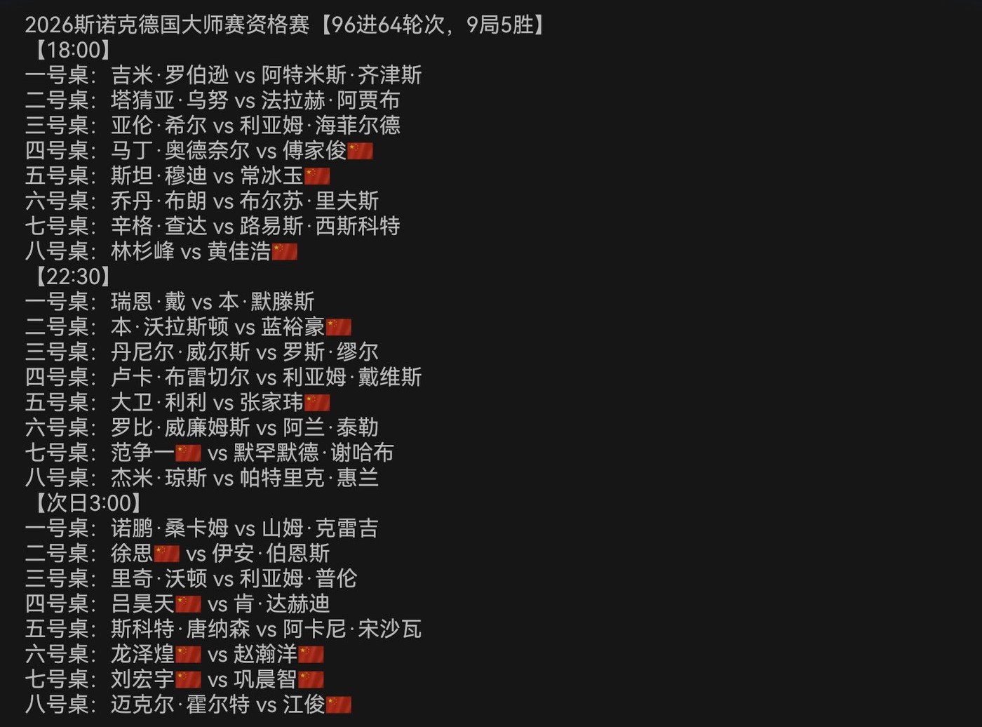 Migu Video and Huya streaming platforms are live streaming the Snooker German Masters Qualifiers match between Chang Bingyu and Stan Moody, with tonight’s (2026.1.7) schedule attached.