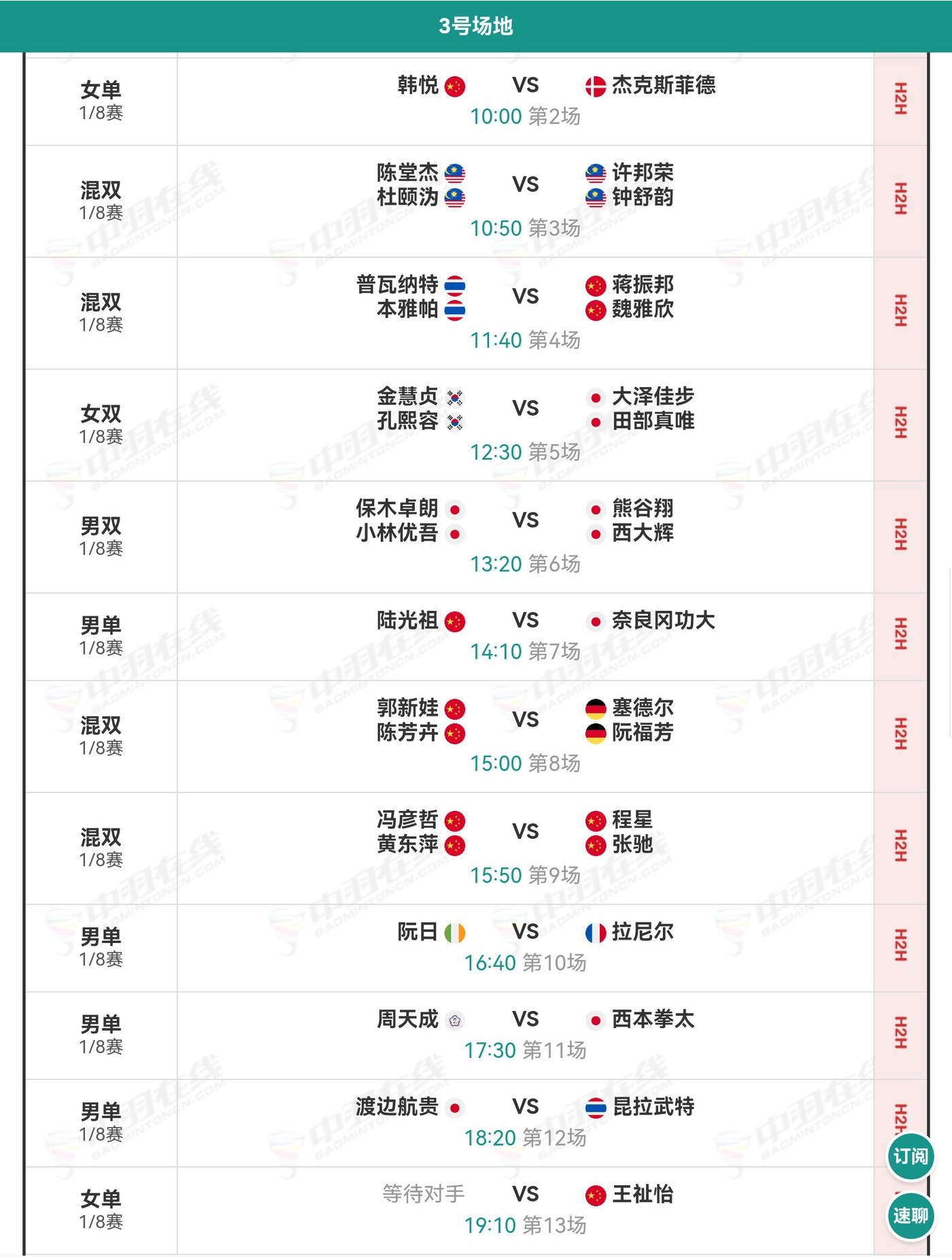 3. On Court 3, Han Yue, the pair Jiang Zhenbang/Wei Yaxin, Lu Guangzu, the pair Guo Xinwa/Chen Fanghui, the pair Feng Yanzhe/Huang Dongping, the pair Chen Xing/Zhang Chi, and Wang Zhiyi will participate. Except for Chen Xing/Zhang Chi and Lu Guangzu, all other Chinese players are expected to win and move on to the next stage.