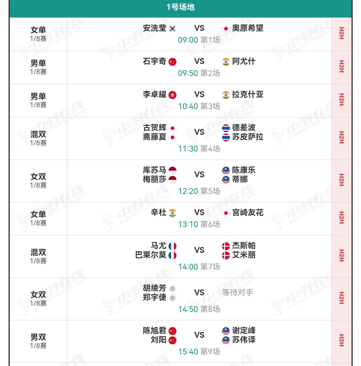 On Court 1, Shi Yuqi and the doubles team Chen Xujun/Liu Yang will take part. Shi Yuqi is certain to win 2-0 and reach the quarterfinals, whereas Chen Xujun/Liu Yang are likely to be knocked out.