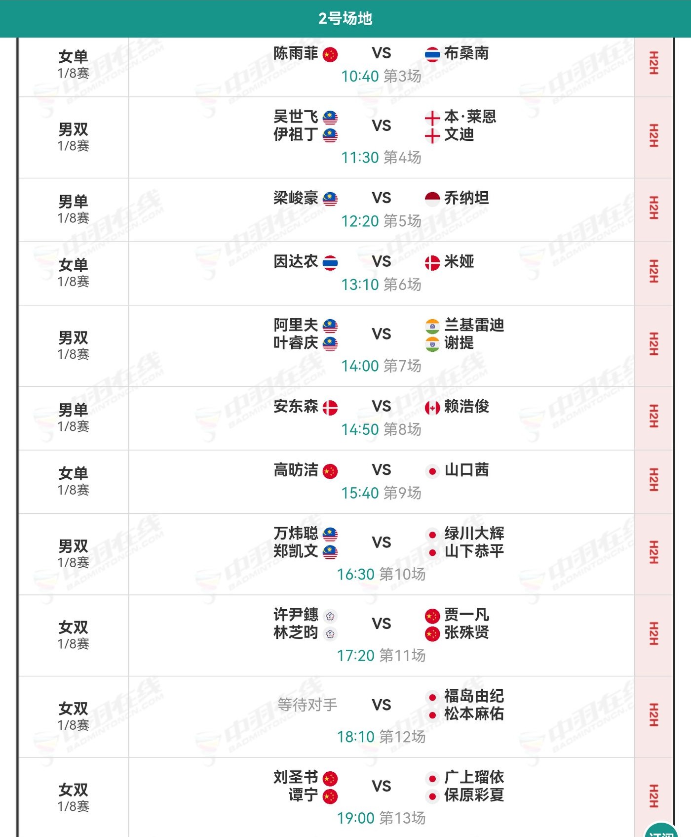 2. On Court 2, Chen Yufei, Gao Fangjie, the pair Jia Yifan/Zhang Shuxian, and Liu Shengshu/Tan Ning will compete. Except for Gao Fangjie, who will probably be eliminated, the other three matches are expected to result in Chinese team victories advancing to the next round.