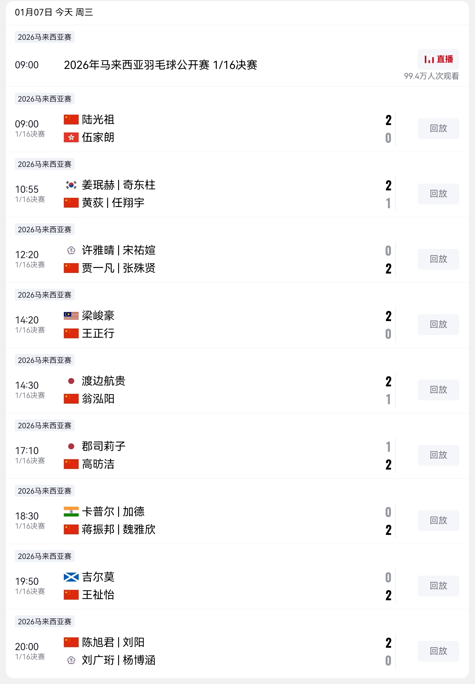 At the Badminton Malaysia Open today (2026.1.7), the Chinese team recorded 6 wins and 3 losses, with Ong Hongyang being eliminated in the first round.