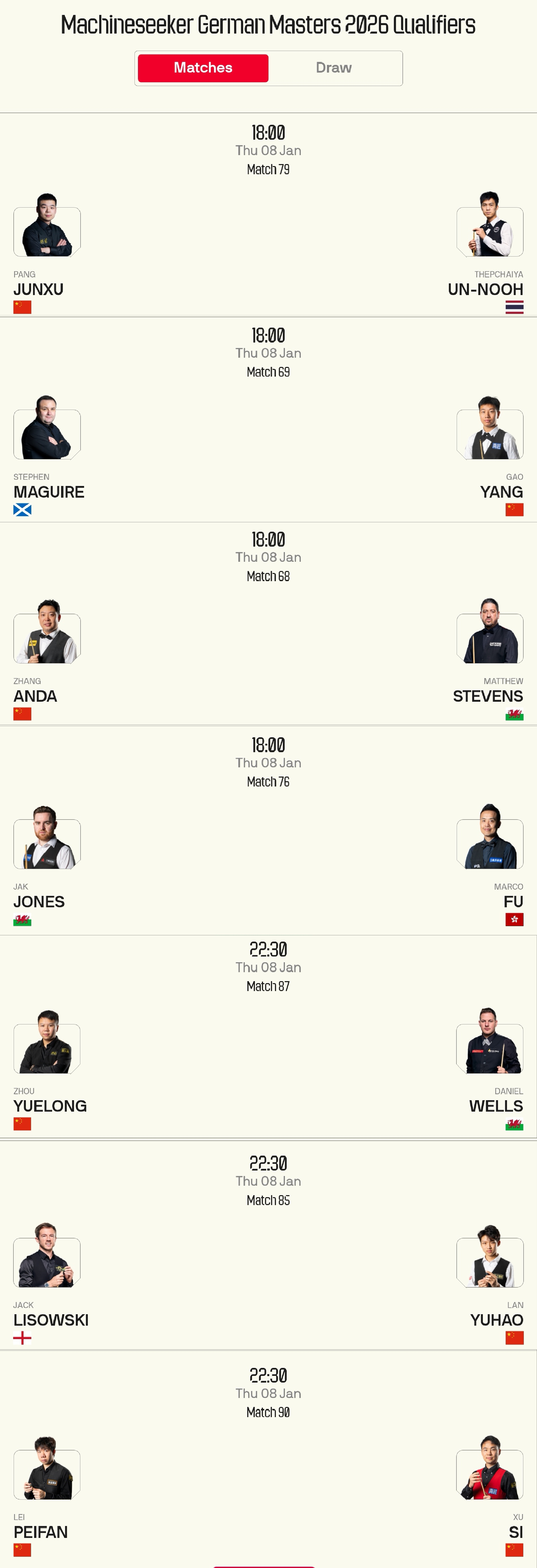 The third qualifying round of the Snooker German Masters and the round of 64 to 32 matches are happening today (2026.1.8), with eight players including Zhou Yuelong, Pang Junxu, and Zhang Anda competing, broadcast on Migu Video and Huya.