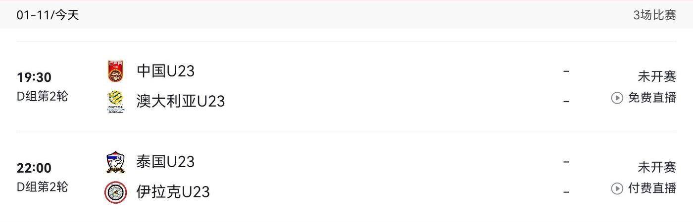 The U23 Asian Cup matches today (2026.1.11) include China vs Australia and Iraq vs Thailand, broadcast live on CCTV-5.