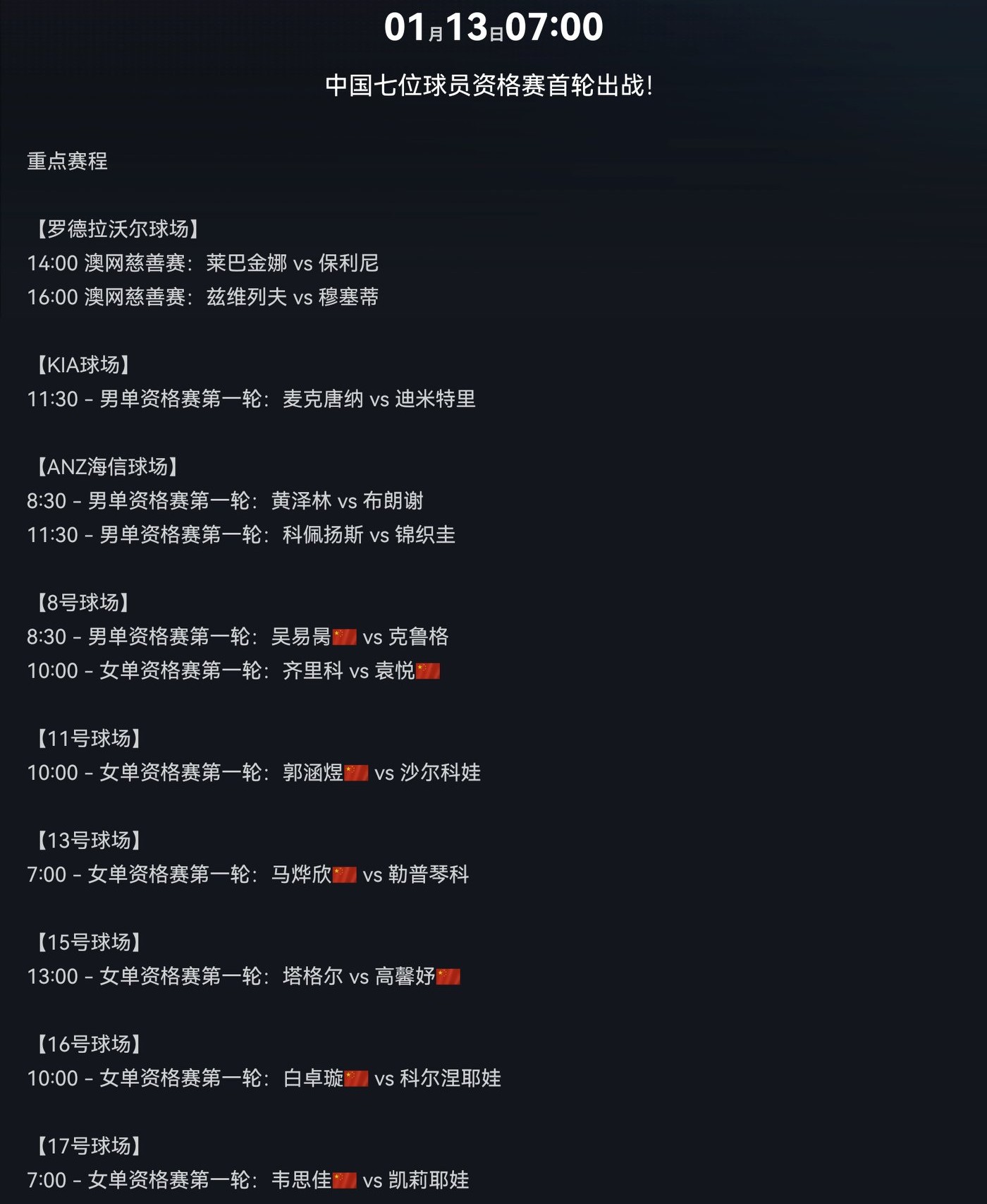 Tomorrow’s Australian Open qualifying matches (January 13, 2026) will see seven Chinese players competing, broadcast live on Migu Video.