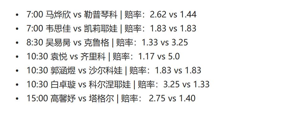 According to current bookmaker odds for these seven Chinese players, only Wu Yibing and Yuan Yue are highly favored; Wei Sijia and Guo Hanyu have a chance to win; the others will likely need to outperform their opponents significantly to progress, at least based on odds.(Source: Tennis Home, Author: Moonlight River’s Starry Sky)