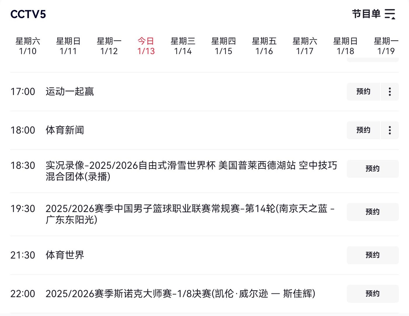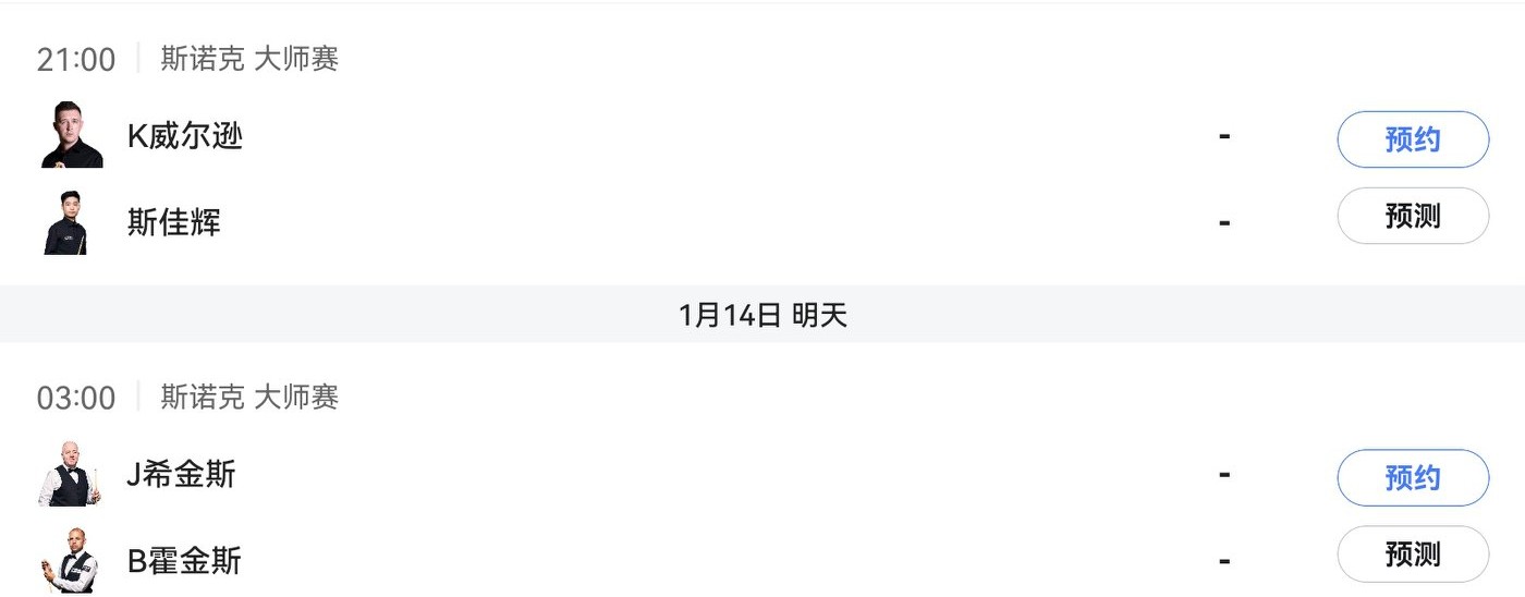 The Snooker Masters matches today (2026.1.13) include Si Jiahui, Higgins, Kyren Wilson, and Barry Hawkins, broadcast live on CCTV-5, CNR Video, and Huya.