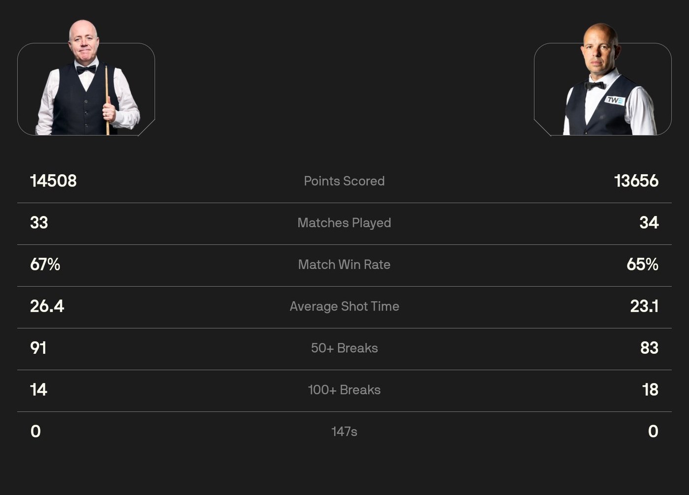 From the statistics, the skill gap between the two is small—they are both top players. So, who will win this match? I still favor Higgins. After all, the "Wizard" is not an easy opponent. My personal prediction is Higgins beating Barry Hawkins 6-4 or 6-5. What do you think?