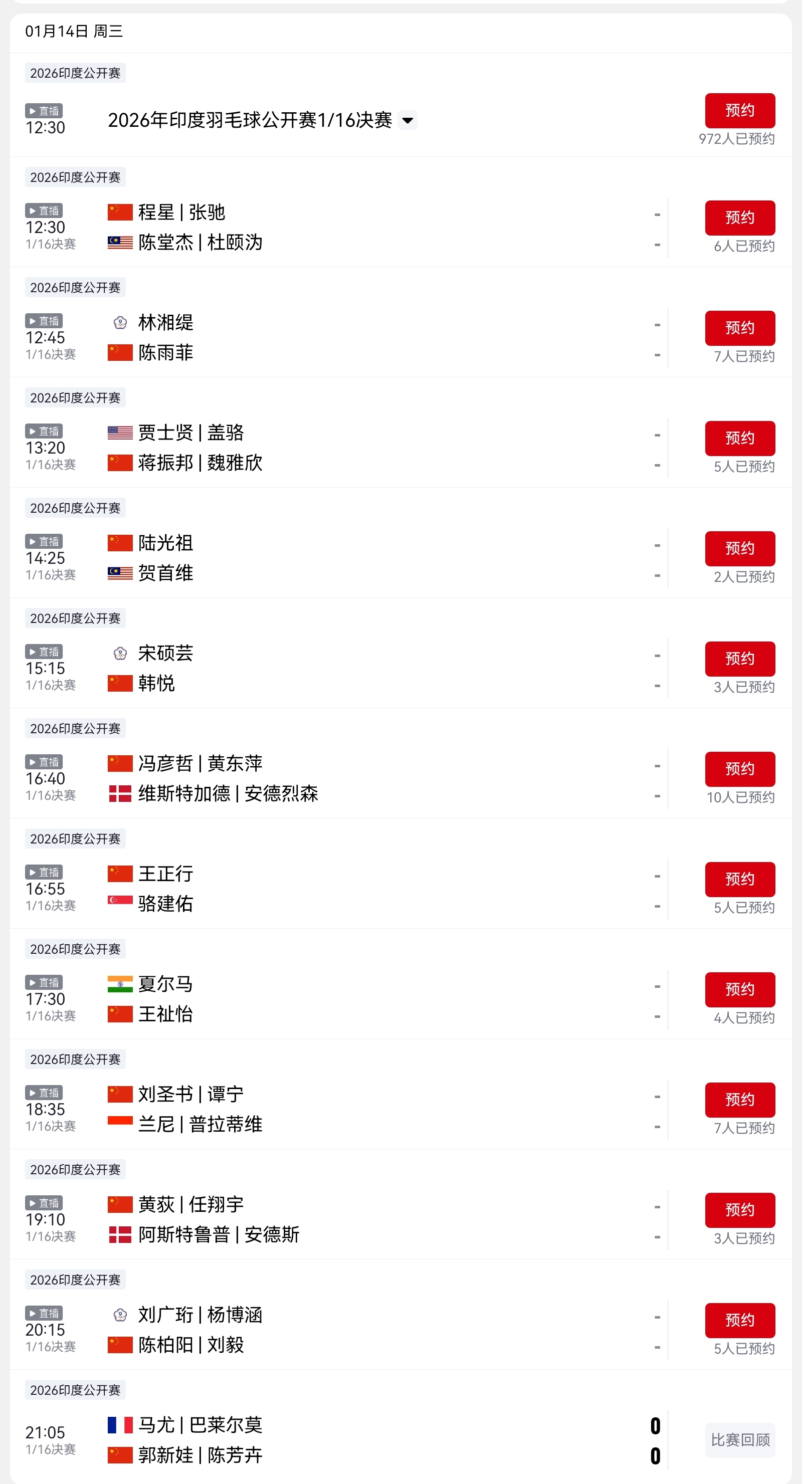 The schedule for the Badminton India Open tomorrow (1.14) features 12 matches with Chinese players competing; live coverage will be on CCTV Video and Youku.