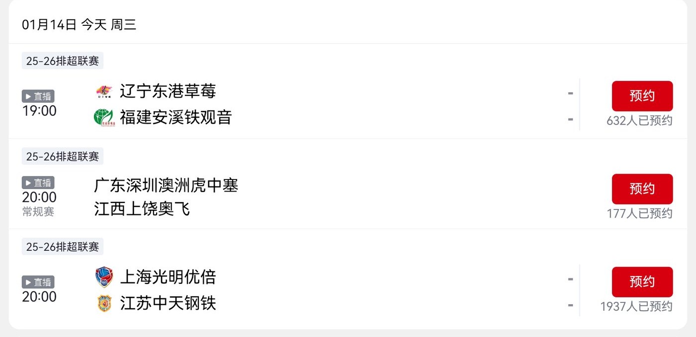 The Women's Volleyball Super League fixtures for today (2026.1.14) include Shanghai vs Jiangsu and Liaoning vs Fujian, with live coverage on CCTV.