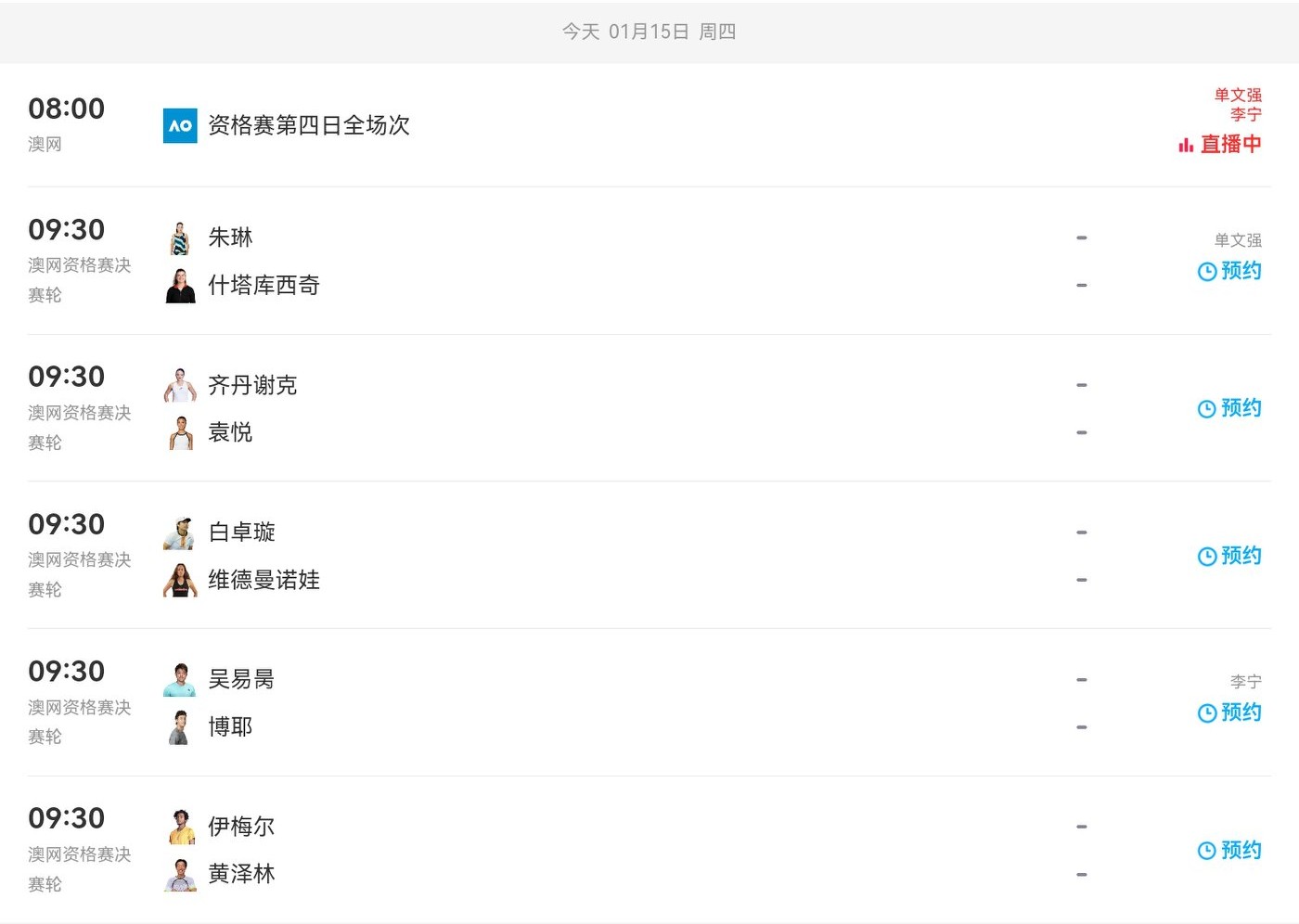 The Australian Open qualifying matches today (2026.1.15) include five national players competing, with live streaming on Migu Video.