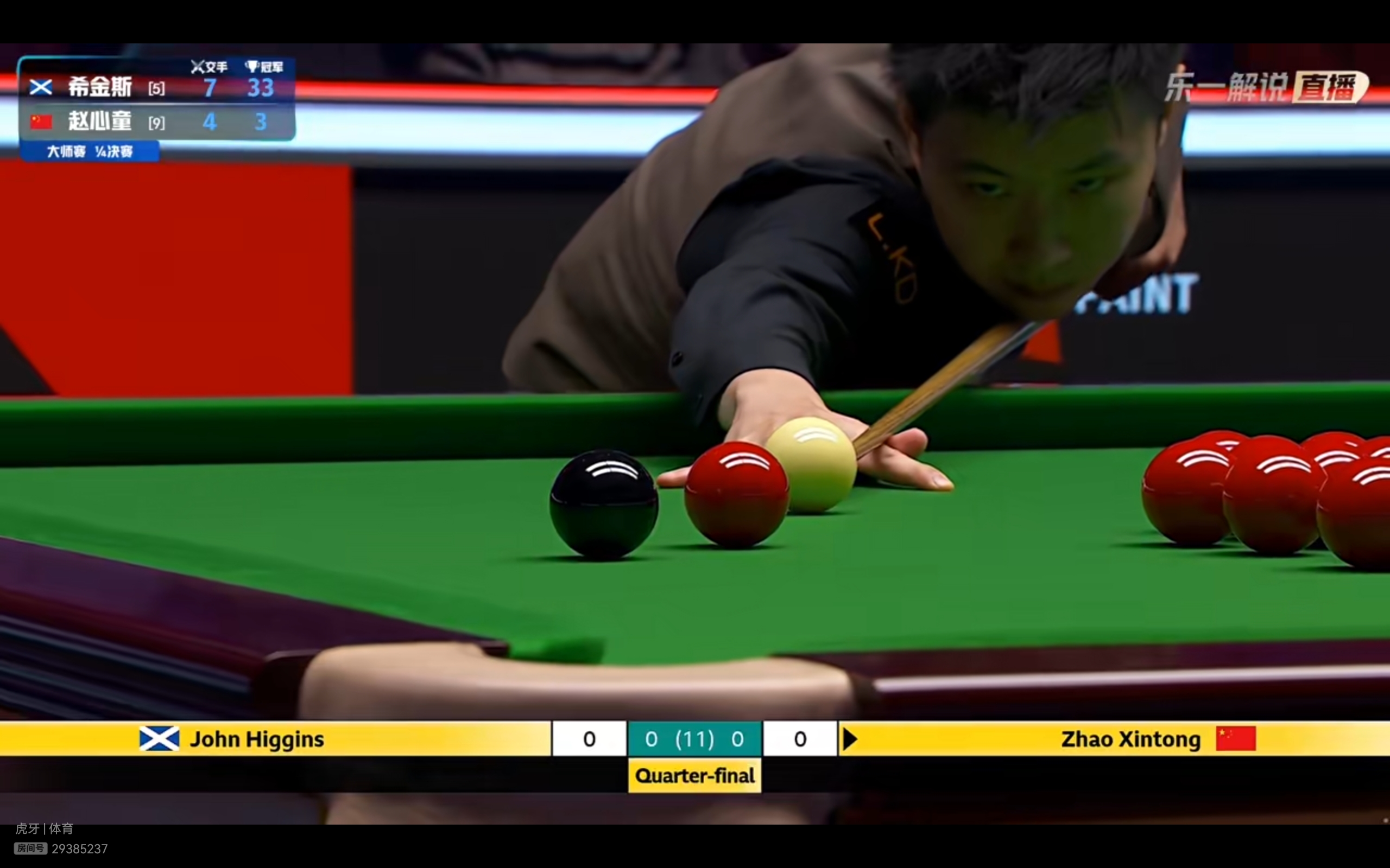 Yangshipin and Huya platforms are offering free live streaming of the Snooker Masters Quarterfinal match between Zhao Xintong and Higgins. CCTV-5 will start live broadcasting at 10 PM this evening.