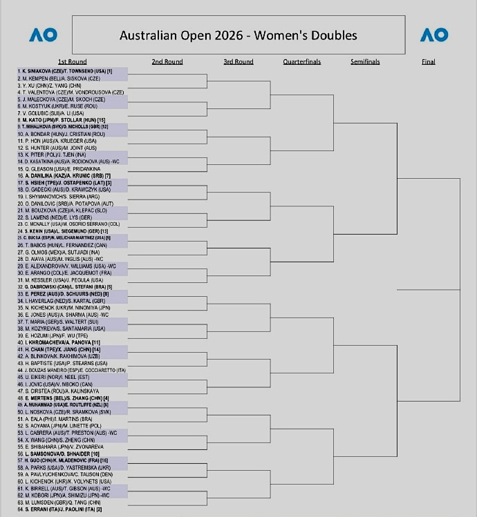 Additionally, yesterday Beijing time, the 2026 Australian Open released the men's and women's doubles draws. The Chinese contingent has 14 players forming pairs to compete. In men's doubles, Shang Juncheng and Zhang Zhizhen face Ebden and Ram; in women's doubles, Xu Yifan and Yang Zhaoxuan play Valentova and Van Uytvanck, Jiang Xinyu and Zhan Haoqing face Blinkova and Laksimova, Zhang Shuai and Mertens meet Kostyia and Kalinskaya, Wang Xinyu and Zheng Saisai play Cabrera and Preston, Guo Hanyu and Muradnovic face Parks and Yastremska, Tang Qianhui and Ramsden play Errani and Paolini. Moreover, Xie Shuwei and Wu Fangxian will team up with Ostapenko and Hozumi Er respectively.